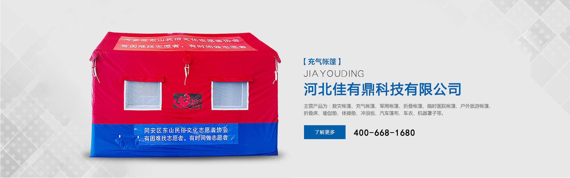 河北佳有鼎科技有限公司原為北京五環精誠帳篷有限責任公司多年來專注于應急救災防護和戶外用品的研發,是一家集研發、設計、生產、銷售、服務于一體的綜合型公司。